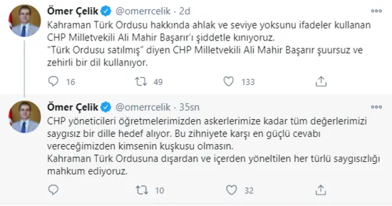 CHP yöneticileri saygısız bir dille hocalarımızdan askerlerimize kadar tüm değerlerimizi hedef alıyor. Bu zihniyete en güçlü cevabı vereceğimizden kimsenin şüphesi olmasın. Kahraman Türk Ordusuna dışarıdan ve içeriden yöneltilen her türlü saygısızlığı kınıyoruz.