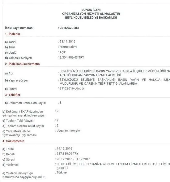 Açık ihale yöntemi ile düzenlenen ve yaklaşık 2 milyon 304 bin 906 TL’ye mal olan ihaleyi Dilde Eğitim Spor Organizasyon ve Tanıtım Hizmetleri Ticaret Limited Şirketi 987 bin 830 TL’ye kazandı. İhalenin ardından röportaj programının gerçekleşmediği, etkinliğe katıldıkları iddia edilen gazeteci ve yazarların etkinlikten haberi bile olmadığı ortaya çıktı.
