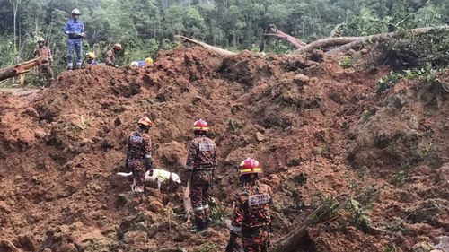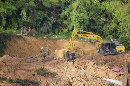 Selangor Eyalet İtfaiyesi, beko ve küreklerle toprak ve molozu kazan kurtarıcıların fotoğraflarını yayınladı. Yetkililer, enkazın sekiz metre derinliğinde olduğunu söyledi. 400’den fazla kurtarıcı ve arama köpeği, hala kayıp olan bir düzine insanı bulmak için bütün gece çalışıyor.