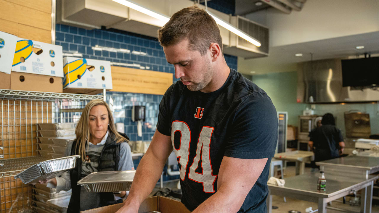 Cincinnati Bengals defans tarafı Sam Hubbard, 22 Kasım Salı günü Bellevue (Kentucky) Okul Bölgesi ve Cincinnati’nin Sheckley Gençlik Merkezi’nde her iki yerde de ailelere tatil yemeği sunmak için durdu.